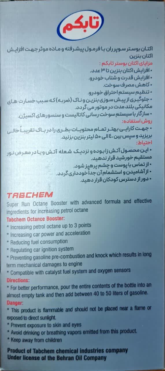 اوکتان بوستر تاپکم تحت لیسانس شرکت نفت بهران اکتان بوستر تابکمبا فرمول پیشرفته و ماده موثر جهت افزایش اکتان بنزینمزایای اکنان پوستر تابکمافزایش اکتان بنزین تا ۳ عدد افزایش قدرت و شتاب خودرو کاهش مصرف سوخت تنظیم سیستم احتراق خودرو جلوگیری از پیش سوزی بنزین و ناک (ضربه) که سبب خسارتهای مکانیکی بلند مدت در موتور می گردد. سازگار با سیستم سوخت رسانی کاتالیست و سنسورهای اکسیژن